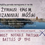 2026-01-08Kvietimas į pojūčių parodą „Žymiausi 1945 m. partizaniniai mūšiai“ Nuo 2026 m. sausio 4 d. iki vasario 4 d. Tuskulėnų memorialinio komplekso Konferencijų salėje eksponuojama pojūčių paroda „Žymiausi 1945 m. partizaniniai mūšiai“. Parodoje pamatysite dešimties 1945 m. vykusių partizanų mūšių interpretacijas meninėse instaliacijose. Parodoje mūšių dalyvių ar liudininkų pasakojamos paveikios, sukrečiančios, bet kartu įkvepiančios bei padrąsinančios istorijos, verčiančios permąstyti ir išryškinti valstybės istorinę atmintį, patriotines vertybes. Parodoje atsispindi mūsų tautos išlikimo esmė – laisvės kovotojų pasipriešinimas, jų nesulaužytas žmogiškasis orumas, nepalaužta dvasia ir laisvės siekis.